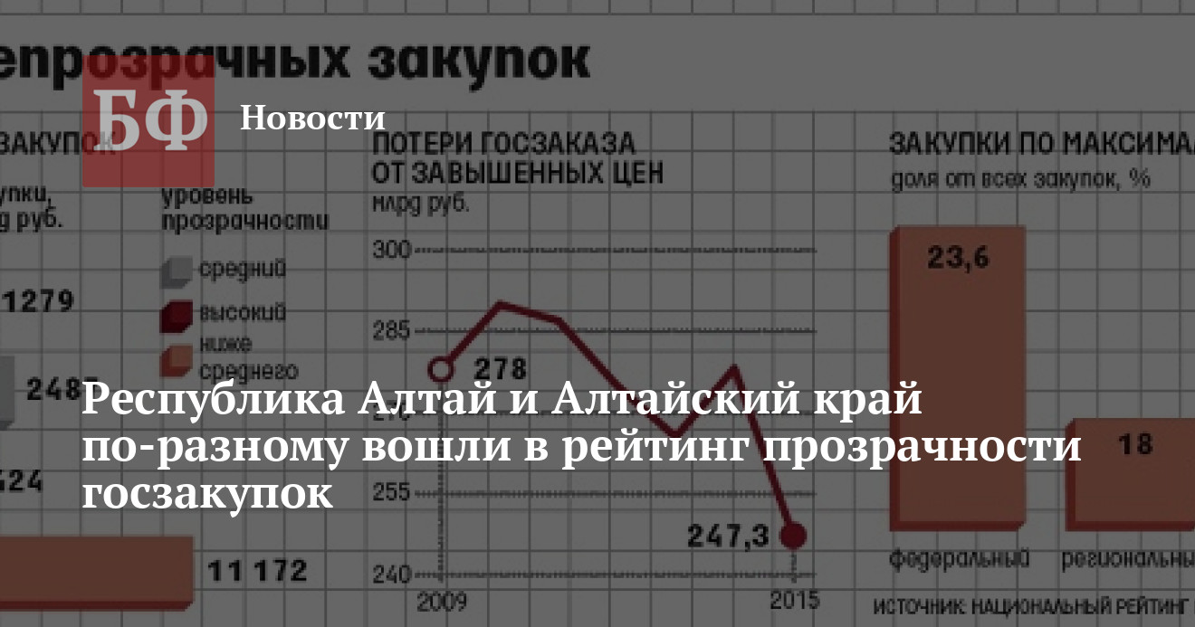 Составители ранжировали всех заказчиков по пяти уровням: гарантированная, высокая, средняя, базовая и низкая прозрачность закупок. Алтайский край попал в третью группу регионов — со средней прозрачностью, набрав 4043 баллла, что позволило занять место между Краснодарским краем и Кемеровской областью. Республика Алтай упала на самое дно рейтинга, расположившись на предпоследнем месте в категории «низкопрозрачных» субъектов. Показатель РА — 2742 балла, меньше лишь у Забайкальского края (2705). Лидирует в даном разделе Москва (5472).