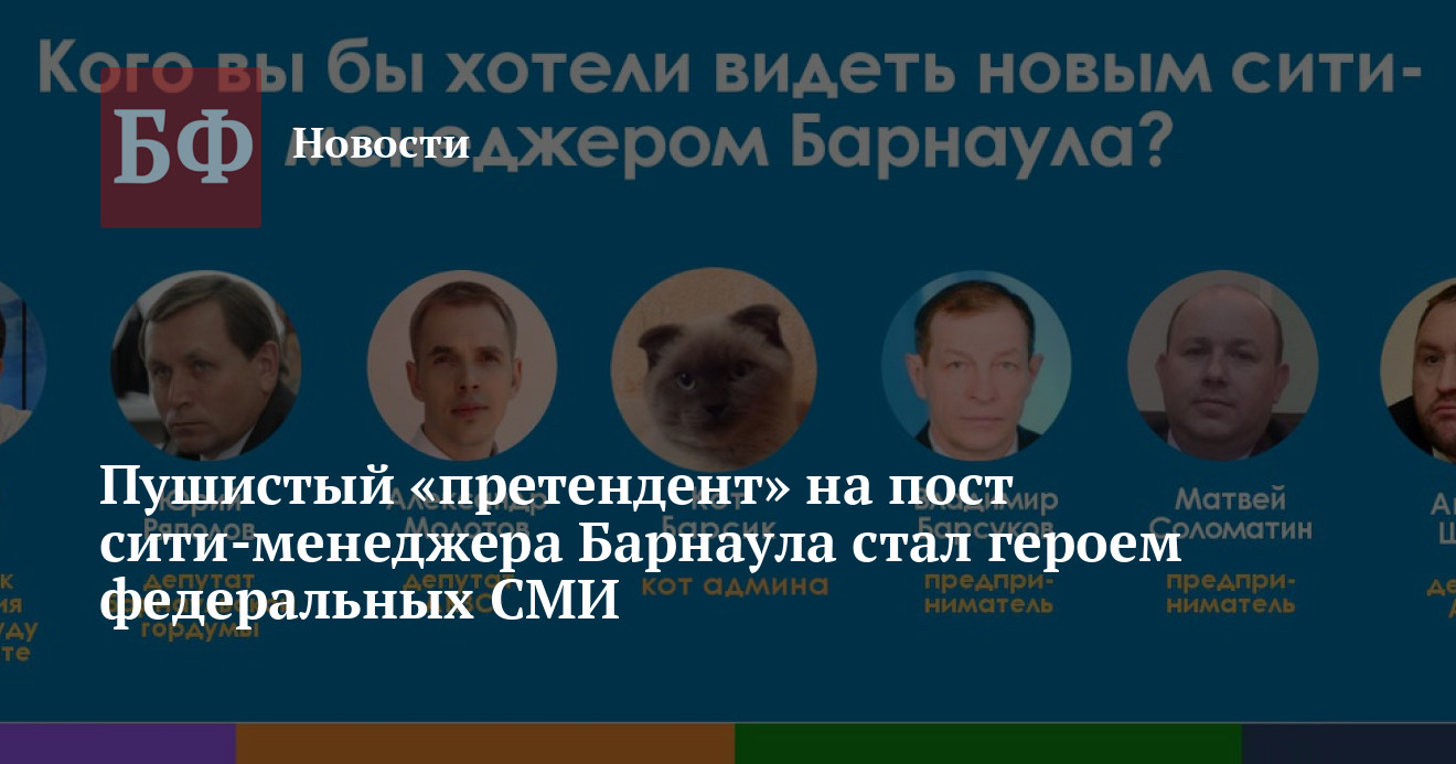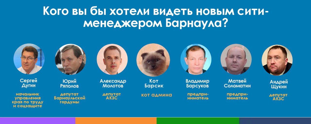 «Алтай online» в подводке к опросу сообщает, что победитель конкурса на замещение вакантной должности градоначальника уже очевиден, несмотря на то, что претендуют на нее шесть кандидатов. «Мы решили внести интригу и добавили еще одного кандидата — кота нашего админа Барсика», — пишут администраторы сообщества.