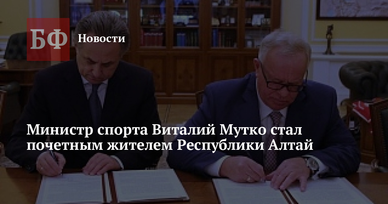 Глава Республики Алтай Александр Бердников присвоил министру спорта России Виталию Мутко звание почетного жителя региона с формулировкой «за заслуги в развитии физической культуры и спорта». Знак почетного жителя г-н Мутко получил во время визита г-на Бердникова в Москву в начале декабря, сообщается на сайте министерства.