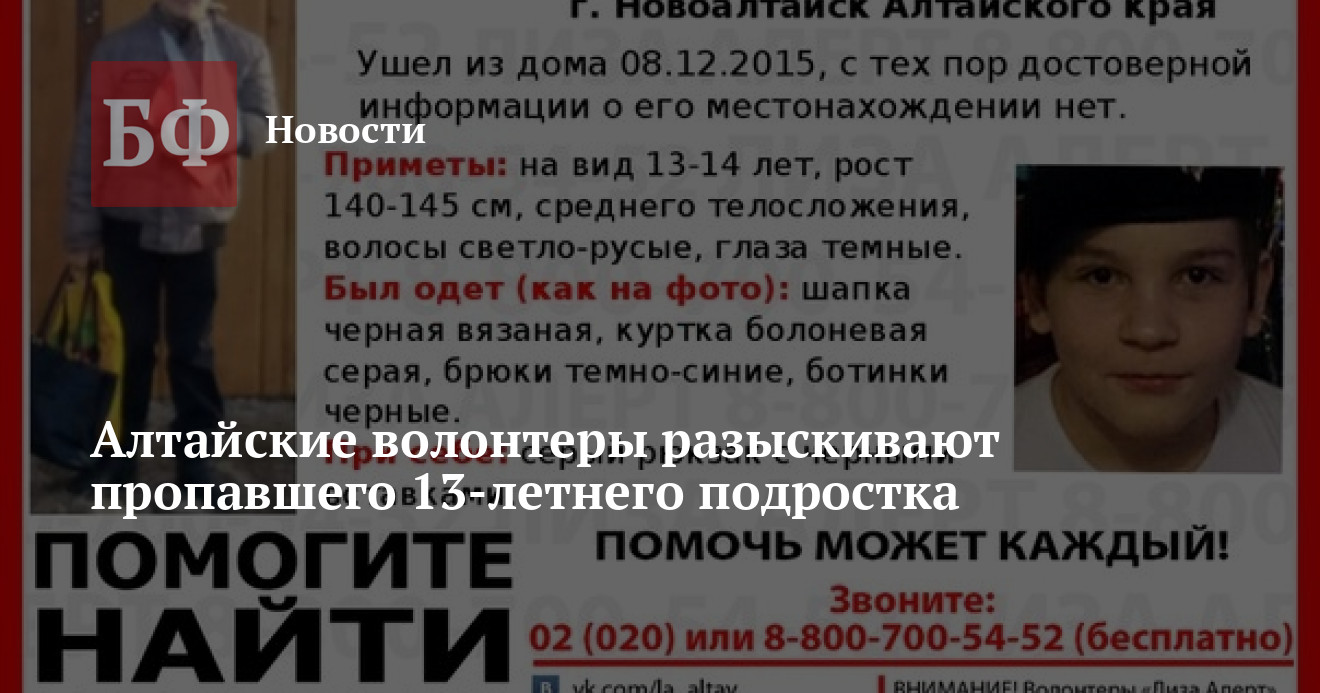 Поисковый отряд «Лиза Алерт» объявил о поисках 13-летнего подростка из Новоалтайска Анатолия Потапова, который 8 декабря ушел из дома, больше его никто не видел. Информация об этом опубликована в официального группе отряда «ВКонтакте».