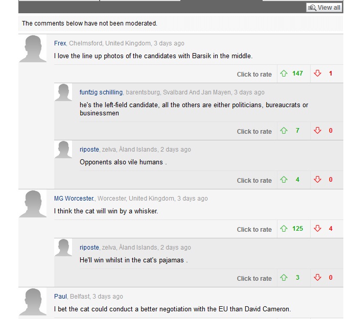 На данный момент публикацией более 2500 раз поделились в соцсетях, под ней собралось 63 комментария. Многие из них радуют английским юмором: «Готов спорить, что кот сможет вести переговоры с ЕС успешнее, чем Дэвид Кэмерон», «Барсик будет более полезен, чем другие кандидаты. Он по крайней мере ловит крыс». Также многие обратили внимание на то, что Барсик — сиамский кот. «Политика кота будет про-китайской и крайне левой — он же «мяуист», — написал один из пользователей. «