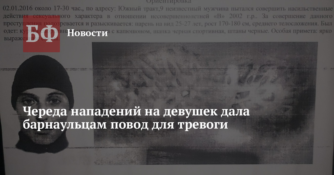 В первые дни 2016 года в Барнауле зафиксировано несколько попыток изнасилования. Затянувшееся празднование Нового года и вынужденное безделье делает рост числа таких случаев предсказуемым, но горожане в соцсетях уже начали беспокоиться, что в краевом центре появился маньяк. Об одном официально подтвержденном случае нападения на девушку свидетельствуют ориентировки, расклеенные в районе поселка Южного, еще о двух сообщают участники сообщества Barnaul 22 «ВКонтакте».