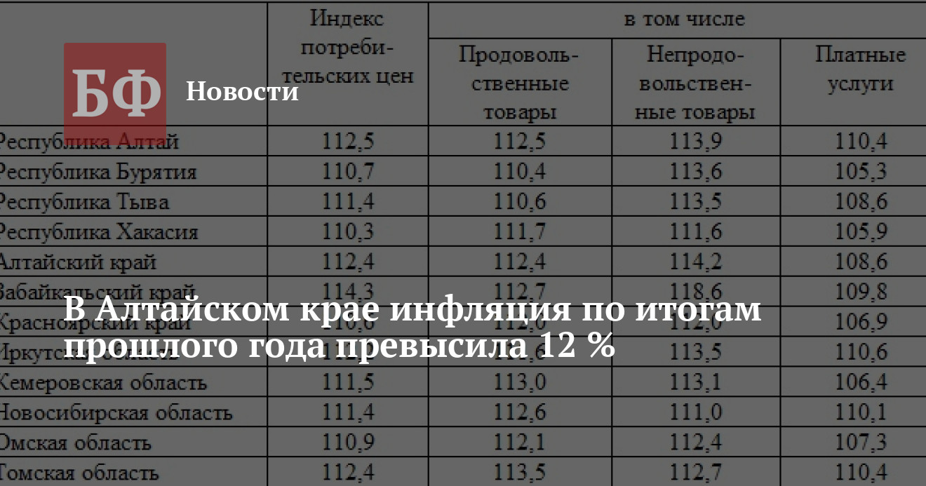 Добавим, годом ранее инфляция в Алтайском крае остановилась на отметке в 11,2%, Республике Алтай — 10,1%. Федеральный индикатор равнялся 11,4%.