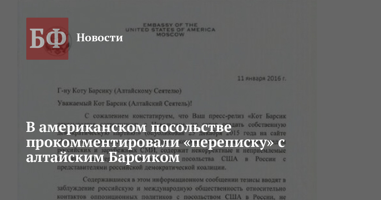 Напомним, ранее Алтайский Сеятель опубликовал в «Алтай Online» письмо, которое посол США в России Джон Теффт якобы написал коту Барсику, прославившемуся практически во всем мире участием в виртуальных «выборах» главы администрации Барнаула. В своем обращении от имени дипломатической миссии г-н Теффт попросил барнаульского кота больше не писать о связи оппозиционеров Алексея Навального и Михаила Касьянова с американской элитой.