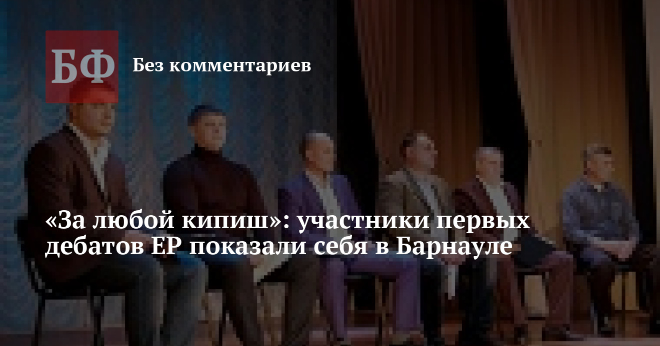 2 апреля стартовали дебаты среди участников предварительного голосования по выбору кандидатов в Госдуму РФ от партии «Единая Россия». Первая площадка в Барнауле была организована в ДК «Октябрьский». Темы для обсуждения — экономическая и промышленная политика, поддержка предпринимательской инициативы. На участие в дебатах записалось шесть человек: Михаил Домуховский (и. о. руководителя Алтайского регионального отделения «Молодой Гвардии Единой России», студент), Денис Кузьмин (менеджер регионального развития ООО «Алтайский провиант»), Николай Петрик (руководитель отдела продаж ООО «АПК»), Михаил Плешивцев (менеджер отдела круп ООО «Алтайский провиант»), Евгений Пушненков (заместитель генерального директора по производству ООО «Компания Холидей Производство» подразделение Офис (Алтай)), и Александр Юдович (пенсионер). «Банкфакс» собрал лучшие моменты встречи.