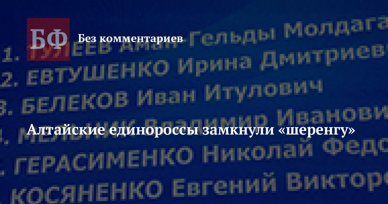 Однако, как видно на фотографии со съезда, которую ИА «Банкфакс» предоставил один из делегатов, алтайские единороссы практически замкнули список. Возглавит группу губернатор Кемеровской области Аман Тулеев. Следом идет зампредседателя Томской гордумы Ирина Евтушенко. Третье место занял спикер Госсобрания Республики Алтай Иван Белеков. Четвертое — депутат Совета народных депутатов Кемеровской области Владимир Мельник, шестое, прямо между двумя кандидатами от Алтайского края, спикер Кемеровского облсовета Евгений Косяненко.