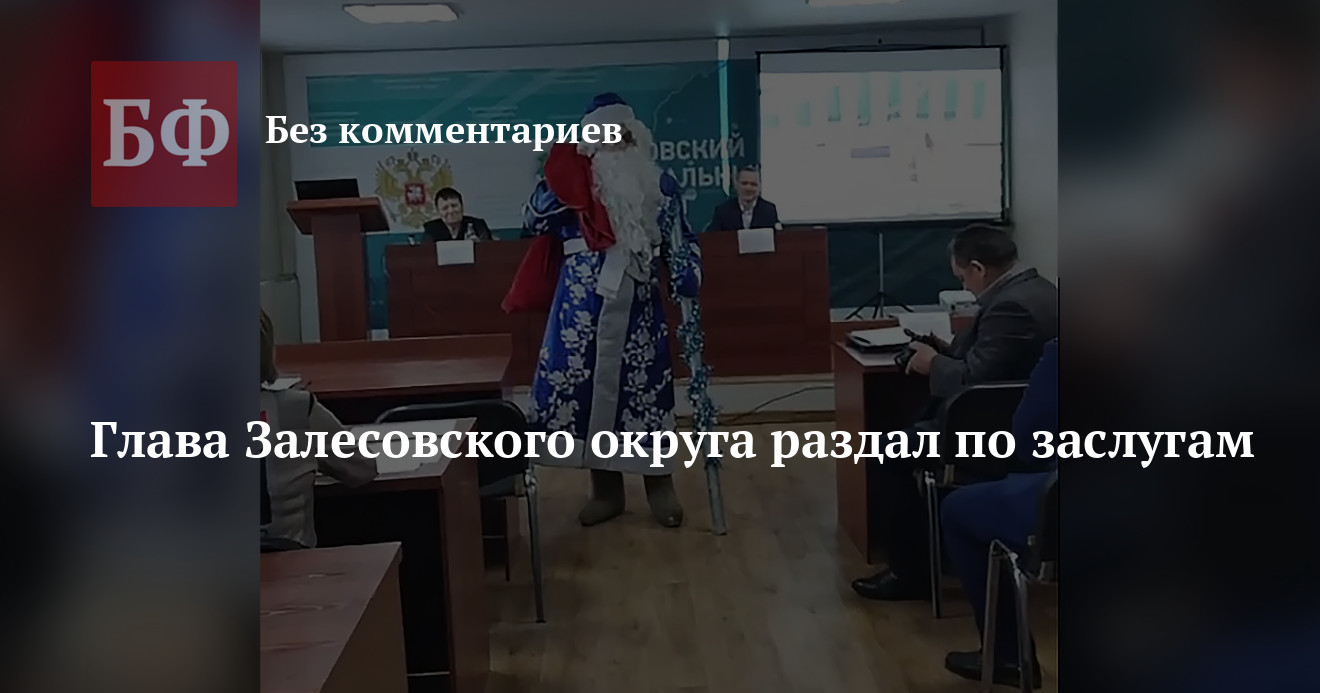 28 декабря состоялась заключительная в 2022 году сессия совета депутатов Залесовского округа. Глава муниципалитета Александр Пластеев решил проводить коллег на каникулы и предстал перед ними в образе Деда Мороза, тем самым создав праздничную атмосферу. Как подобает, персонаж пришел не с пустыми руками. «Сегодня подарки из этого мешка каждый получит по заслугам», — сказал он. В том же наряде чиновник отправился поздравлять детей, о чем он сообщил в своем Telegram-канале.