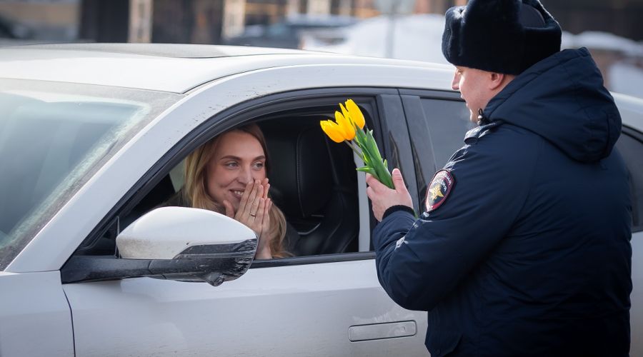 Сотрудники Госавтоинспекции Барнаула провели акцию «Автоледи» и поздравили женщин с наступающим Международным женским днем. Полицейские пожелали прекрасной половине человечества крепкого здоровья, весеннего настроения, благополучия и любви, а также напомнили о важности соблюдения ПДД. Кроме того, дамам вручили подарки: билеты в цирк, сертификаты ювелирного салона, автомобильные аксессуары и, конечно же, цветы и открытки.