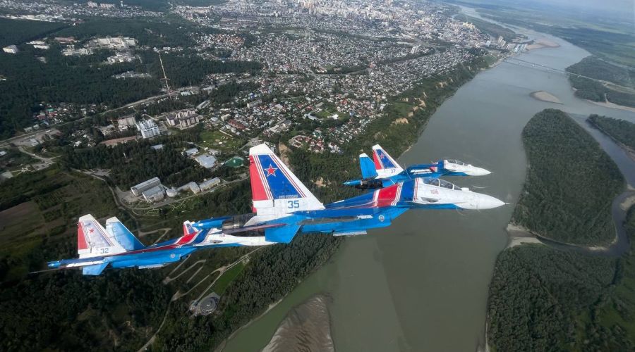 Авиационная группа высшего пилотажа «Русские Витязи» прибыла в Барнаул. Об этом сообщается в Telegram-канале пилотов. Перед посадкой в аэропорту, истребители несколько раз облетели город, чем порадовали барнаульцев. Летчики встретятся со школьниками, состоящими в военно-патриотических клубах, расскажут о профессии летчика, управлении самолетом. Также детям покажут новые модели российских истребителей. «Русские витязи» впервые выступят в Барнауле на праздновании Дня города 31 августа с 17:00 до 18:00. Тренировочные выступления жители города смогут увидеть 30 августа с 15:00 до 15:30.