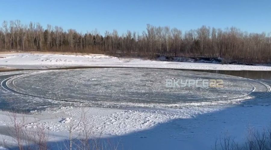 На реке Чумыш рядом с селом Акулово Первомайского района заметили редкое природное явление – «ледяной диск». Сбившаяся в гигантский круг шуга медленно крутится вокруг своей оси.
