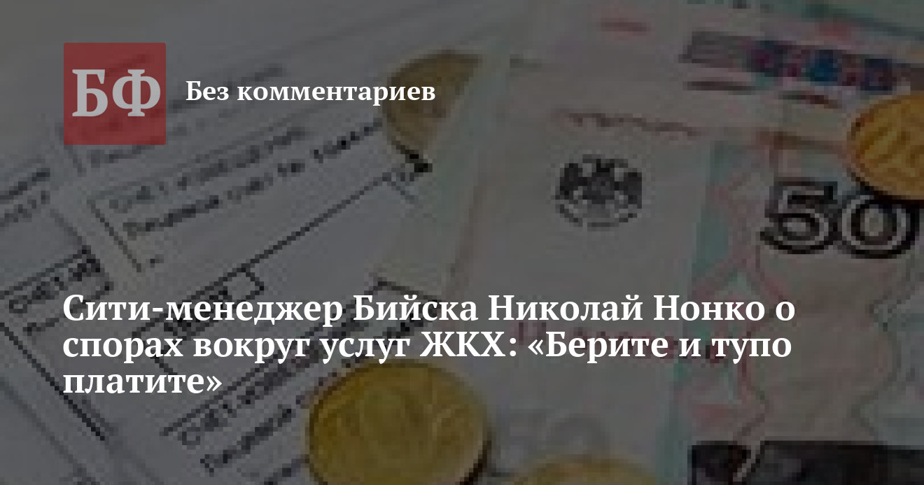 Накалившаяся ситуация вокруг оплаты коммунальных услуг обсуждалась на расширенном совещании в администрации Бийска. Сити-менеджер Николай Нонко призвал управляющие компании и ТСЖ стать «парламентерами» между населением и ресурсоснабжающими организациями. Жителям он посоветовал не донимать ресурсовиков, дать время разобраться, а пока «тупо платить», сохраняя квитанции за каждый месяц.
