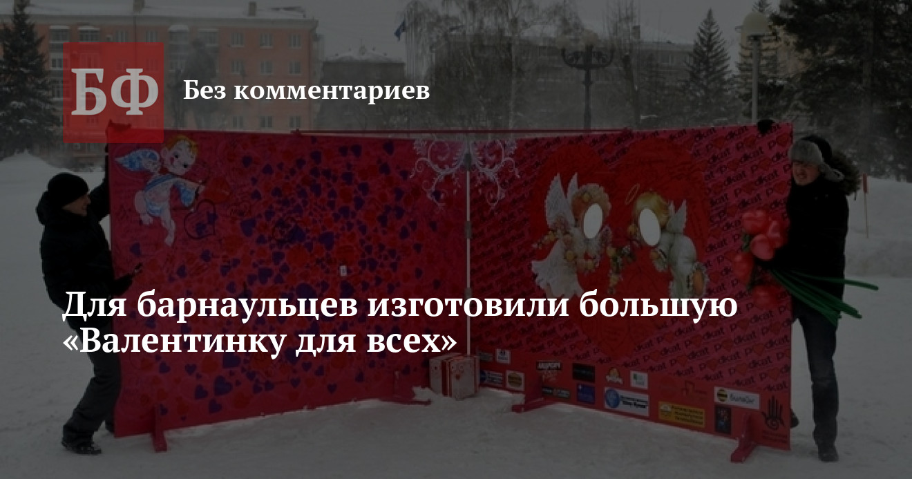 Агентство необычных свиданий Podkat изготовило для жителей Барнаула «Валентинку для всех». Конструкцию размером 2 на 5 метров размещали в краевом центре у крупнейших вузов. 14 февраля поздравление на ней до 15:30 можно оставить у алтайского «политеха».