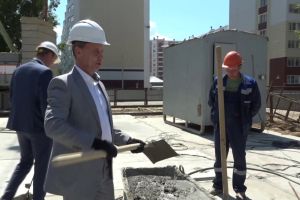 Мэр Барнаула Вячеслав Франк посетил стройплощадку и символично помог установить первую плиту новостройки для переселенцев из аварийного жилья