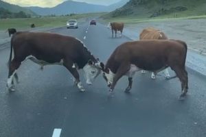 В Республике Алтай туристы стали свидетелями боя быков прямо посреди дороги.