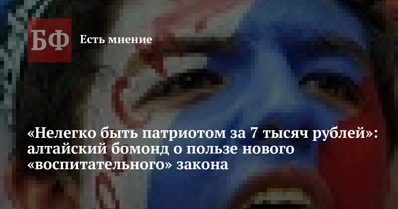 В ближайшие месяцы Алтайское Заксобрание намерено принять закон «О патриотическом воспитании». В первом чтении документ был одобрен еще в августе 2015 года. Обострившаяся активность народных избранников, вероятно, связана с недавним выступлением Владимира Путина, в котором президент упомянул о патриотизме как об единственной связующей идее в России. ИА «Банкфакс» вместе с алтайской интеллигенцией выясняло, что стоит за попытками отрегулировать «духовную сферу» и зачем любовь к Родине стоит облекать в рамки законодательства.
