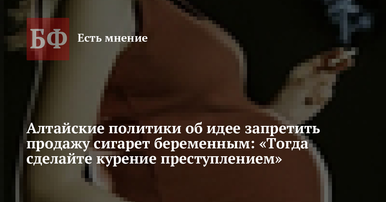 В Министерстве здравоохранения Алтайского края предложили запретить продажу сигарет беременным женщинам, а чтобы доказать отсутствие беременности прекрасному полу предлагают каждый месяц получать справку у гинеколога. Эта тема, наряду с другими антитабачными инициативами последних месяцев, вызвала широкую полемику: кто-то назвал идею антиконституционной и ущемляющей права женщин, кто-то считает, что только там мы сможем в будущем получить здоровое поколение. Своим мнением с ИА «Банкфакс» поделились алтайские политики и общественники.