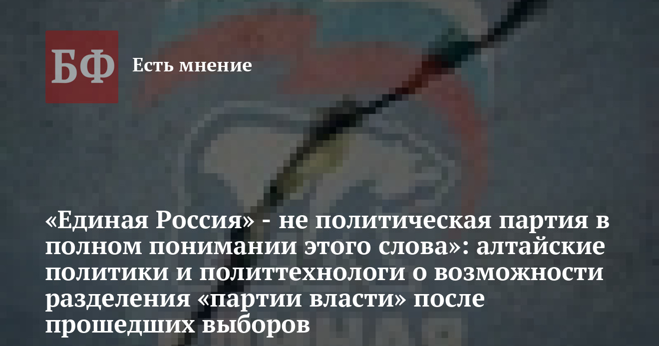 После выборов 8 сентября портал «Проект» со ссылкой на источники сообщил, что команда бизнесмена Евгения Пригожина (он обычно фигурирует в СМИ как близкий президенту человек) разработала для Кремля и уже представила руководству президентской администрации концепцию партийной реформы. Суть ее состоит в том, что для решения проблемы якобы снизившегося рейтинга «партии власти» ее нужно ликвидировать, а вместо нее создать две другие партии — либеральную и консервативно-патриотическую. О реакции администрации президента на такой проект пока неизвестно, однако один из высокопоставленных единороссов, узнав об этом от «Проекта», высказался об авторах нелестно. При этом наблюдатели в ходе избирательной кампании обратили внимание, что некоторые единороссы в разных регионах участвовали в выборах как самовыдвиженцы, а использование партийной символики было ограничено. Тем временем ИА «Банкфакс» выяснил у известных в Алтайском крае политиков и политологов, как они смотрят на такую реофрму, и действительно ли выигравшим выборы единороссам стоит опасаться за свой рейтинг.