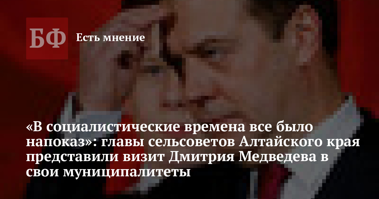Недавний приезд председателя правительства РФ Дмитрия Медведева в Алтайский край наделал много шуму и в Барнауле, и на местах. Премьер-министр в ходе визита пообщался не только с представителями региональной власти, но и «вышел к народу». Одним из самых ярких событий рабочей поездки Медведева стало общение с жительницей села Санниково, которая бросилась ему под ноги с мольбами. Женщина пожаловалась на отсутствие в ее многоквартирном доме горячей воды, хотя всего за несколько минут до этого глава сельсовета убеждал, что серьезных проблем в муниципалитете нет. Медведев тут же распорядился решить ситуацию и губернатор Виктор Томенко уже дал необходимые распоряжения. В связи с мощным резонансом от этого инцидента на местах корреспондент ИА «Банкфакс» пообщался с главами других алтайских сельсоветов на тему того, как бы они встретили дорогого гостя, о чем поговорили бы с ним по душам и считают ли приемлемым поступок жительницы Санниково.