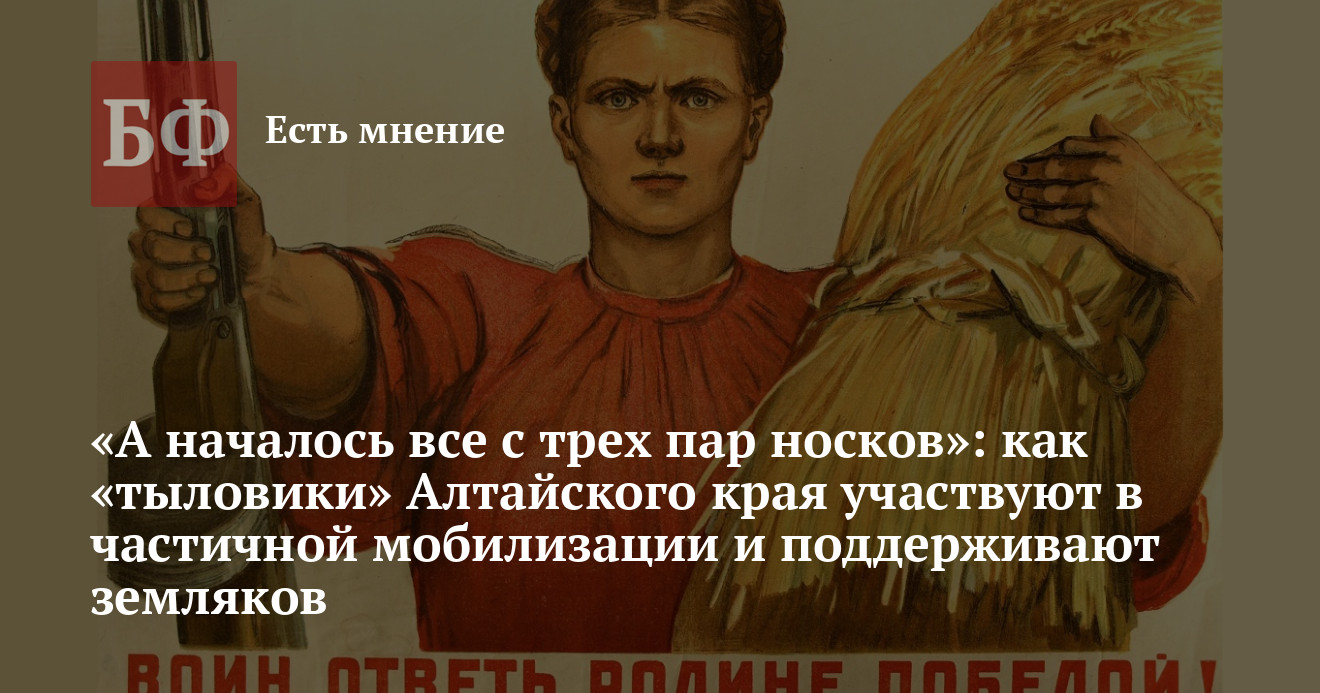 После объявления в России частичной мобилизации стало ясно, что призванным резервистам необходима помощь тыла, несмотря на то, что Минобороны обеспечивает военнослужащих всем необходимым. Уже не секрет, что вчерашним гражданским, а сегодня военным, проходящим подготовку перед отправкой в зону спецоперации, нужны дополнительные вещи, начиная от термобелья и обуви, заканчивая аптечками и средствами связи. Сбор пожертвований в виде денег и конкретных предметов организовали во многих регионах страны, и Алтайский край не стал исключением. Разумеется, правительство в стороне не осталось, назначило мобилизованным выплаты в размере 100 тысяч рублей и организовало социальную работу с семьями мужчин. «Банкфакс» из первых уст узнал, как в регионе организована поддержка на других уровнях: со стороны местных властей, предпринимателей, общественников и, конечно, неравнодушных граждан.