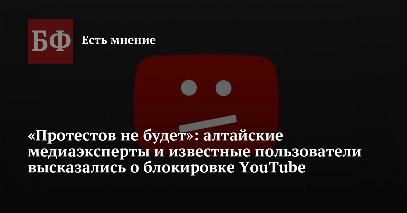 Если говорить про то, будут ли протесты по поводу блокировки YouTube в Барнауле, то я думаю, что нет, поскольку какие-то крупные каналы в нашем регионе особой роли на формирование общественного мнения не играют. Возможно, где-нибудь в Москве, в Санкт-Петербурге, в таких урбанизированных регионах это и вызовет какие-нибудь одиночные акции, но какой-то серьезный протест это не спровоцирует.