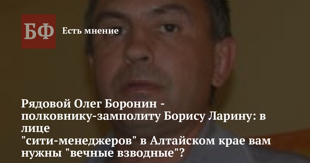 Я господину Ларину, как бывшему военному, так скажу. Был у нас в ТуркВО начальник штаба полка полковник Безруков, «пожизненное» место которому — командир взвода или на худой конец — роты. Везде нос совал, пытался подменять собой младших офицеров. В хорошем, позитивном плане старался это делать. В итоге все его благие побуждения и начинания постоянно создавали всеобщий бардак. Но зато многие бойцы полка мечтали заполучить Безрукова в качестве своего ротного. Но не более того. Его так и звали — «вечный взводный». Это для вас идеал главы администрации муниципалитетов Алтайского края?