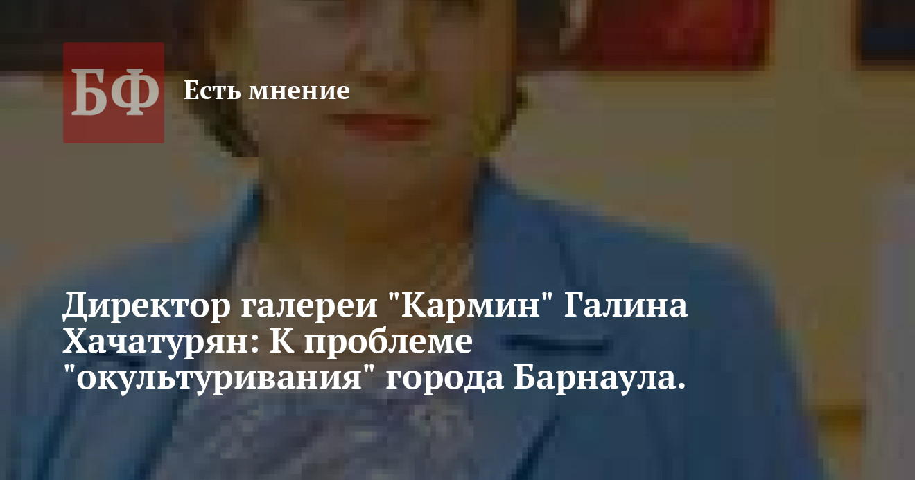 — С чего начать окультуривание Барнаула? С окультуривания чиновников: для начала хотя бы научить их приходить на открытие выставок. В ГХМАКе на юбилейной выставке Майи Ковешниковой, замечательной художницы, уважаемого человека, никого от «культуры» не было (прибежал Черниченко [замглавы администрации Барнаула по соцполитике — БФ], и тот опоздал).