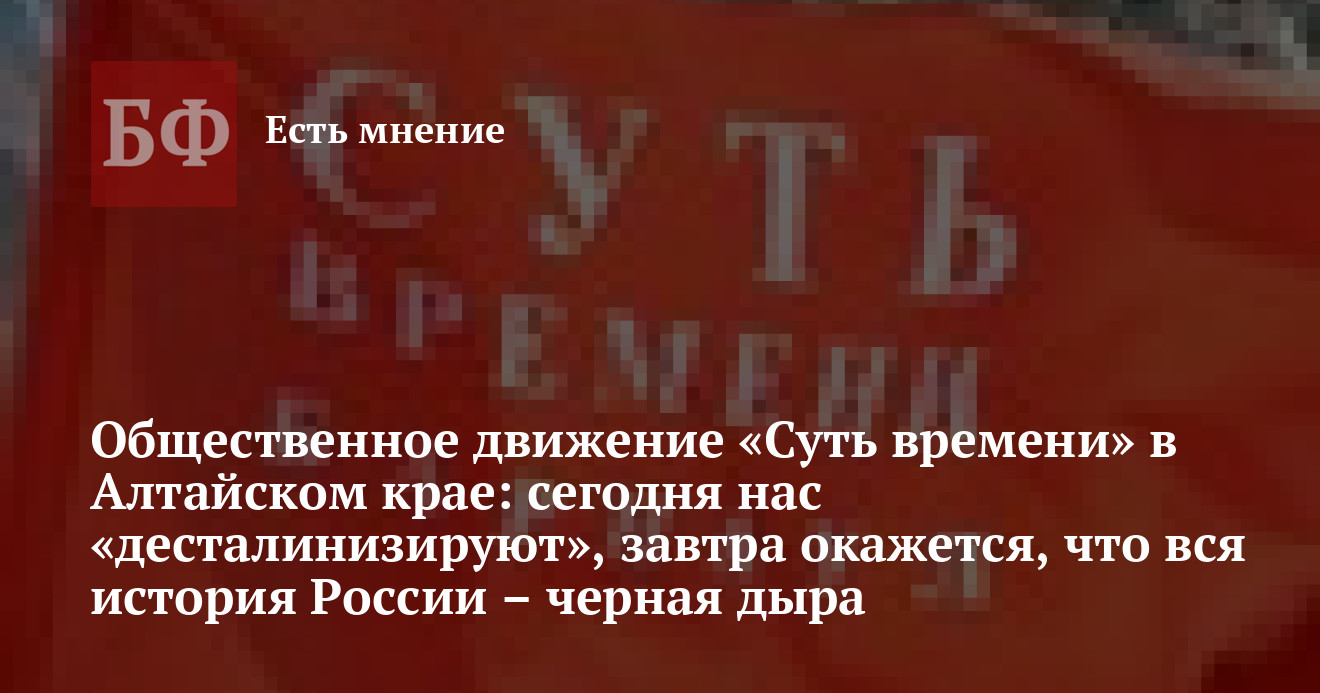Алтайское региональное отделение общественного движения «Суть времени» распространило свою позицию в ответ на заявление лидера алтайских «яблочников» Александра Гончаренко по поводу необходимости дать «должную оценку преступлениям сталинизма перед человечеством и собственным народом». Активисты «Сути времени» считают, что проведение десталинизации и десоветизации противоречит общественному мнению и угрожает территориальной целостности и суверенитету страны. Точка зрения общественников приведена ниже: