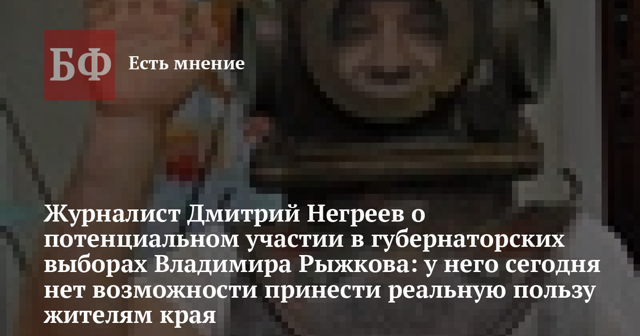 В последнее время заговорили о возможном участии сопредседателя «РПР-ПАРНАС» Владимира Рыжкова в губернаторских выборах в Алтайском крае в 2014 году. Свое мнение по этому поводу высказал известный алтайский журналист, редактор информационно-аналитического сайта «ПолитСибРу» Дмитрий Негреев: