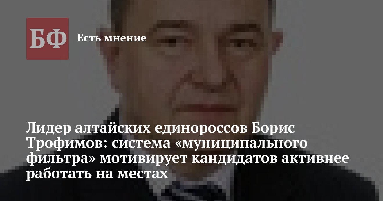 Секретарь алтайского регионального отделения партии «Единая Россия», руководитель фракции «ЕР» в краевом парламенте Борис Трофимов высказался о так называемом муниципальном фильтре, который, по мнению оппозиции, стал препятствием для проведения конкурентных выборов главы региона в 2014 году. С точки зрения г-на Трофимова, «муниципальный фильтр» является хорошей проверкой на профпригодность кандидата в губернаторы. Своей позицией по этому поводу он поделился с ИА «Банкфакс»: