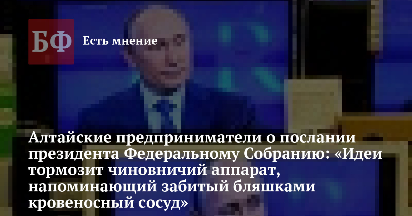 title="Алтайские предприниматели о послании президента Федеральному Собранию: «Идеи тормозит чиновничий аппарат, напоминающий забитый бляшками кровеносный сосуд»"
