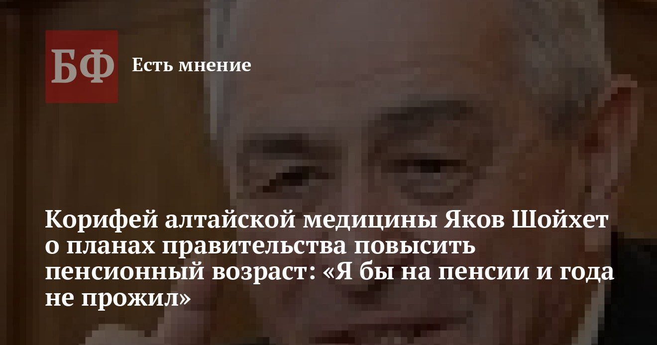 «Ветеран» алтайской медицины, доктор медицинских наук, профессор, член-корреспондент РАМН, заслуженный деятель науки РФ, завкафедрой факультетской хирургии АГМУ Яков Шойхет согласен с утверждением министра. Он рассказал ИА «Банкфакс» о том, как сохранять здоровье благодаря труду, и предположил, работники каких еще профессий готовы к плавному повышению пенсионного возраста.