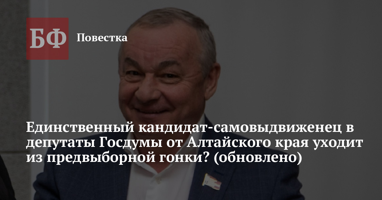 UPD 14:21: позже в избирательной комиссии Алтайского края подтвердили, что к ним действительно поступило заявление от кандидата в депутаты Государственной Думы Федерального Собрания РФ Владимира Попова, выдвинутого по Рубцовскому одномандатному избирательному округу № 40, об отказе от дальнейшего участия в выборах.