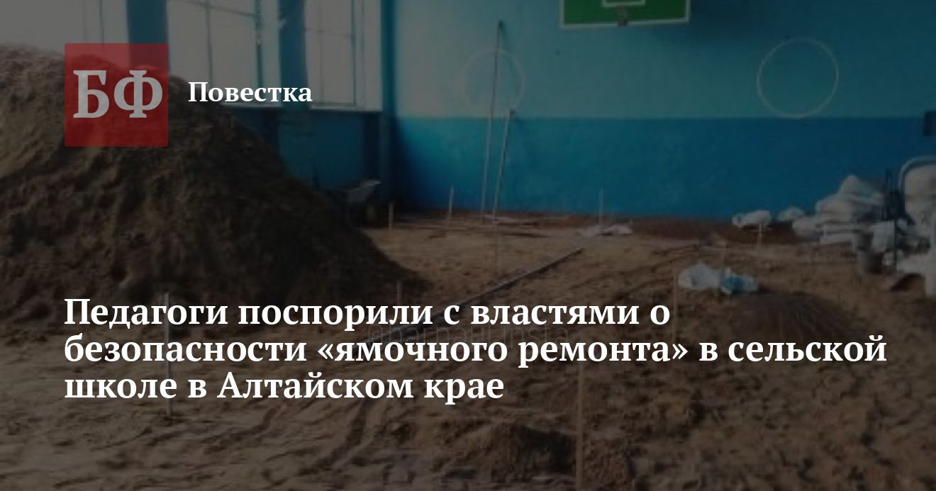 В соцсетях и мессенджерах распространяется информация коллектива МКОУ «Солоновская СШ им. Н.А. Сартина» в Волчихинском районе о ремонте спортзала, который должен был завершиться до начала учебного года, но идет до сих пор. По мнению педагогов, это не только нарушает образовательный процесс, но и представляет потенциальную опасность для детей. В районном комитете по образованию «Банкфаксу» заявили, что ответственность за ситуацию лежит на подрядчике, который якобы ведет себя недобросовестно. Однако же строители настаивают, что проблема заключается в неверно составленной смете и в отсутствии оперативного отклика со стороны местных властей.