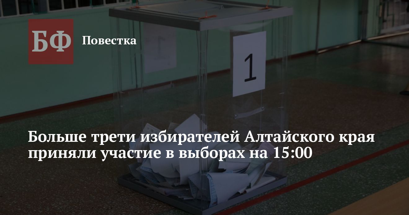 По предварительным данным на 15:00, в голосовании приняли участие уже 625 259 граждан. Явка составила 34,49%. Лидерами по активности граждан по-прежнему остаются Родиниский район — 61,3%, ЗАТО Сибирский — 62,1% и Суетский район — 56,6%. В Тюменцевском районе проголосовало больше половины жителей — 52,8%, в Алейском — 52,1%.