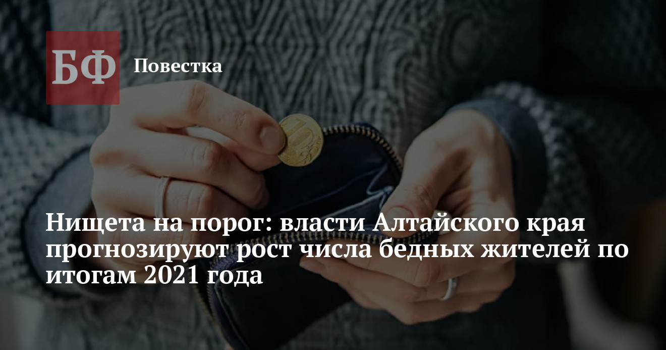 По словам главы управления по труду Надежды Капура, доля бедного населения в Алтайском крае за последние годы практически не изменилась. Если в 2017 году она составляла 17,5% от общей численности, то в 2020 — 17,6%, а в реальном выражении 410 тысяч человек. По классификации чиновников, бедным считается гражданин, чьи доходы находятся на уровне ниже прожиточного минимума. В 2021 году в регионе он составляет 10 665 рублей. При этом власти уже подсчитали, что в 2022 году он поднимется до 11 092 рублей. Согласно другим подходам, доход ниже этой отметки говорит не о бедности, а о крайней нищете, поскольку человеку не хватает денег даже на еду.
