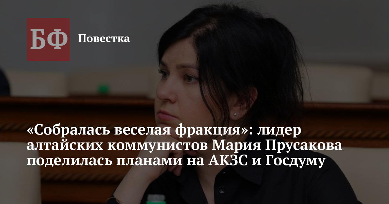 По словам коммунистки, фракция КПРФ в Алтайском Заксобрании получилась неоднородной, но от того, по ее мнению, только более интересной. «У нас собралась веселая фракция, да и на расклад сил будет интересно посмотреть», — заявила Мария Прусакова. По ее убеждению, некоторые новые депутаты-коммунисты способны затмить даже громкого эсера Василия Железовского, который не стеснялся в выражениях на сессиях прошлого созыва. «Я вам обещаю, что так и будет. И не потому, что у нас там люди не профессиональные, а потому, что партия для них — не пустой звук, а дело их жизни. Причем не на профессиональной основе, многие занимаются партийной работой в свободное от основной работы время. И депутатский мандат — площадка, чтобы говорить о проблемах», — пояснила коммунистка.