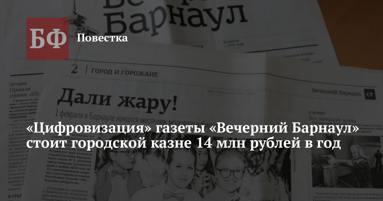 Расходы на финансовое обеспечение деятельности официального печатного органа администрации краевого центра — газеты «Вечерний Барнаул» — в 2021 году выросли без малого на 14 млн рублей и достигли почти 44 млн рублей в год на фоне «цифровизации». Кроме того, штат организации при переходе на новую модель увеличили на 15 позиций, сообщили «Банкфаксу» в мэрии в ответ на запрос. Примерно такие же траты запланированы в городской казне и на 2022 год.