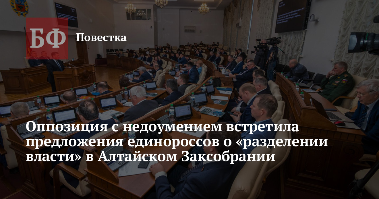 28 сентября избранные в новый созыв Алтайского Заксобрания выдвиженцы от «Единой России» провели первое организационное заседание, на котором сформировали свои предложения о структуре регионального парламента. Они хотели бы оставить за собой девять из 14 оплачиваемых ставок, в том числе пост спикера и одного из вице-спикеров, а также восемь должностей на неосвобожденной основе. По сведениям ИА «Банкфакс», представители «партии власти» готовы отдать своим главным оппонентам из КПРФ лишь кресло второго вице-спикера, а представителям ЛДПР и эсерам предложить должности председателей двух оставшихся «бесхозными» комитетов. Пятой фракции — «Коммунистам России» — места в этом раскладе предположительно вообще не нашлось. Такая позиция ЕР, теперь не имеющей большинства, вызвала недоумение в рядах алтайской оппозиции. Представители всех четырех фракций заявили, что переговоры по каждой должности все еще активно ведутся, поэтому заявления единороссов до заседания общего оргкомитета АКЗС, намеченного на конец сентября, выглядят как минимум опрометчиво и несерьезно.