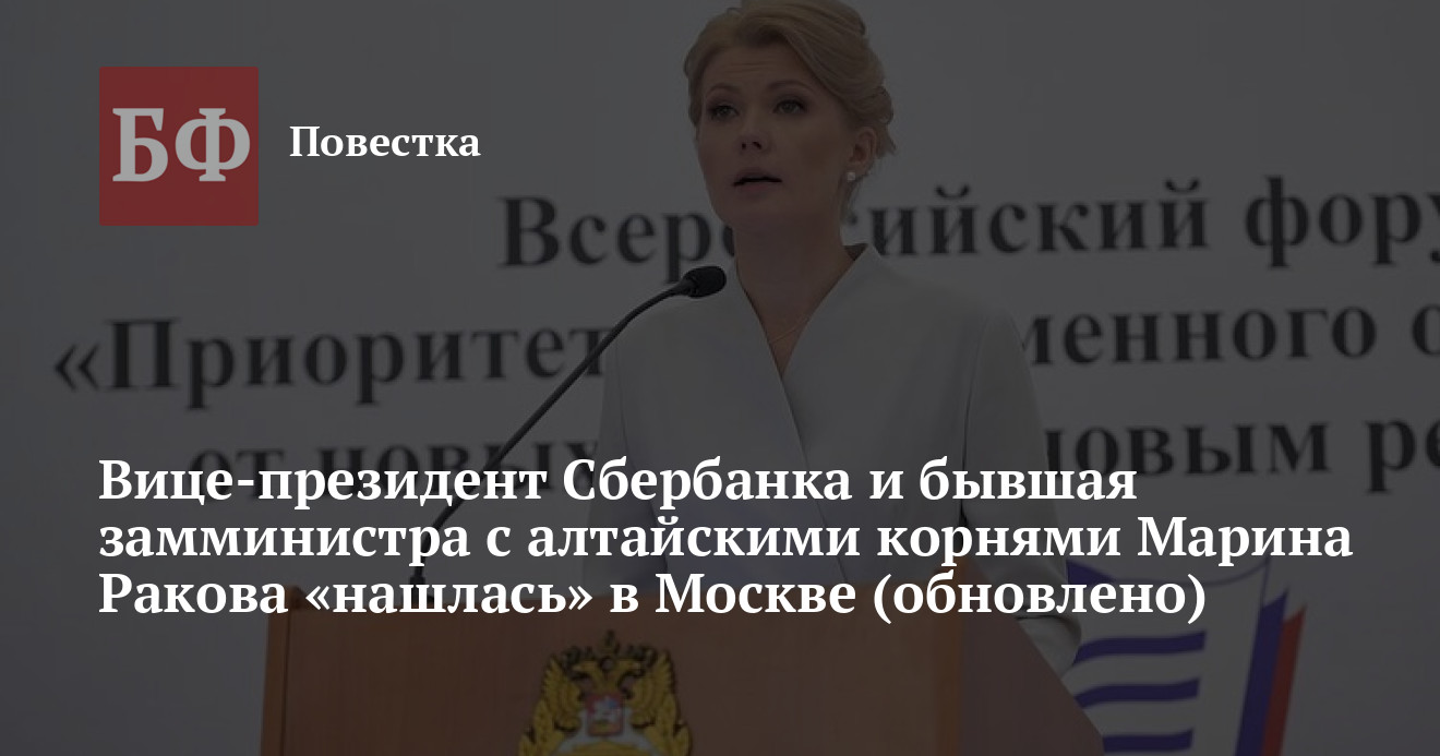 Уроженка Алтайского края, вице-президент Сбербанка, бывшая замминистра просвещения РФ Марина Ракова находится в полиции и дает показания. Об этом сообщает пресс-центр МВД России, не уточняя подробности ее обнаружения. Раковой уже предъявлено обвинение в хищении денежных средств в особо крупном размере.