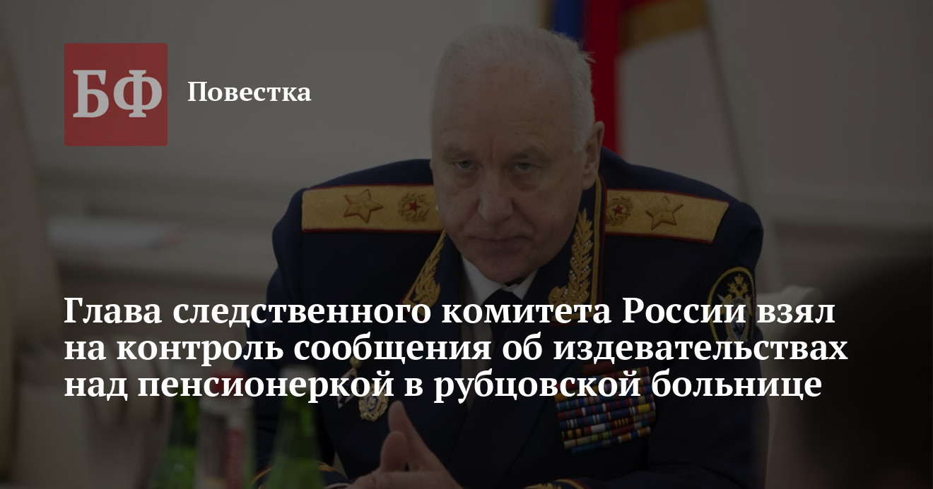 Руководитель Следственного комитета России Александр Бастрыкин отреагировал на публикации СМИ о неправомерных действиях медперсонала ковидного госпиталя в Рубцовске. Ранее родственники 86-летней пациентки Марии Бондаренко заявили, что пенсионерку насильно удерживали там и применяли к ней физическую силу. Глава СКР взял ситуацию на контроль. Тем временем в Минздраве края заявили, что не увидели в действиях медработников каких-то нарушений.