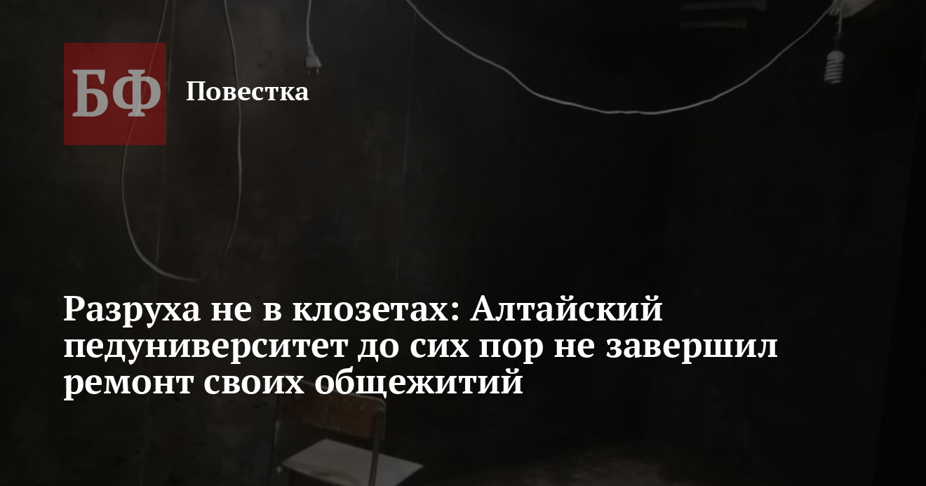 Напомним, что скандал с ремонтом в общежитиях Алтайского педуниверситета начался после того, как в социальных сетях и мессенджерах стали распространяться фотографии комнаты в общежитии № 5, которую вуз предоставил студентке-первокурснице. «В комнатах полный бардак, в коридорах света нет — вместо патронов торчат провода. Комнаты как после бомбежки, нет штор, нормальных кроватей — ничего! Мебель в комнатах вся обшарпанная, облупленная. Но это ладно. Повсюду строительный мусор и пыль, которая не смывается», — писала она. Жалобы поступали и от родственников других студентов. «Общежитие разгромлено, не работает душ и туалет, света нет, везде пыль и грязь», — описала ситуацию сестра одной из учащихся.