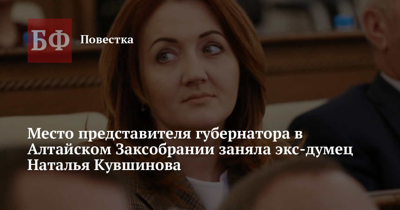 … Виктор Томенко утвердил в должности представителя губернатора и правительства Алтайского края в Заксобрании Наталью Кувшинову, которой не удалось получить депутатский мандат на прошедших выборах. Как сообщает пресс-служба кабмина, она уже приступила к работе. Ранее этот пост занимала Стелла Штань, осужденная за коррупционное преступление…. Путин слово держит, своих не бросает, трудоустраивает.