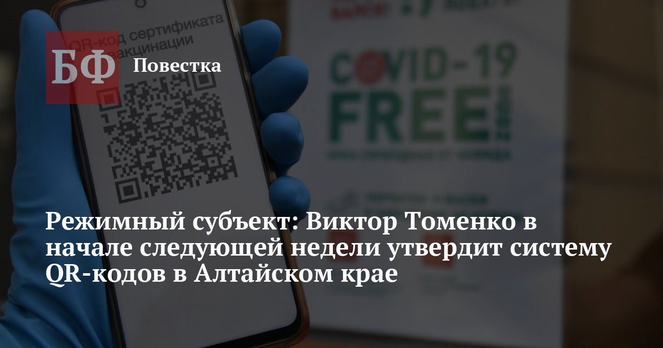 Указ о введении в Алтайском крае режима QR-кодов при посещении объектов с массовым пребыванием людей начнет действовать с конца октября или начала ноября. Об этом сообщил ТАСС со ссылкой на губернатора региона Виктора Томенко.