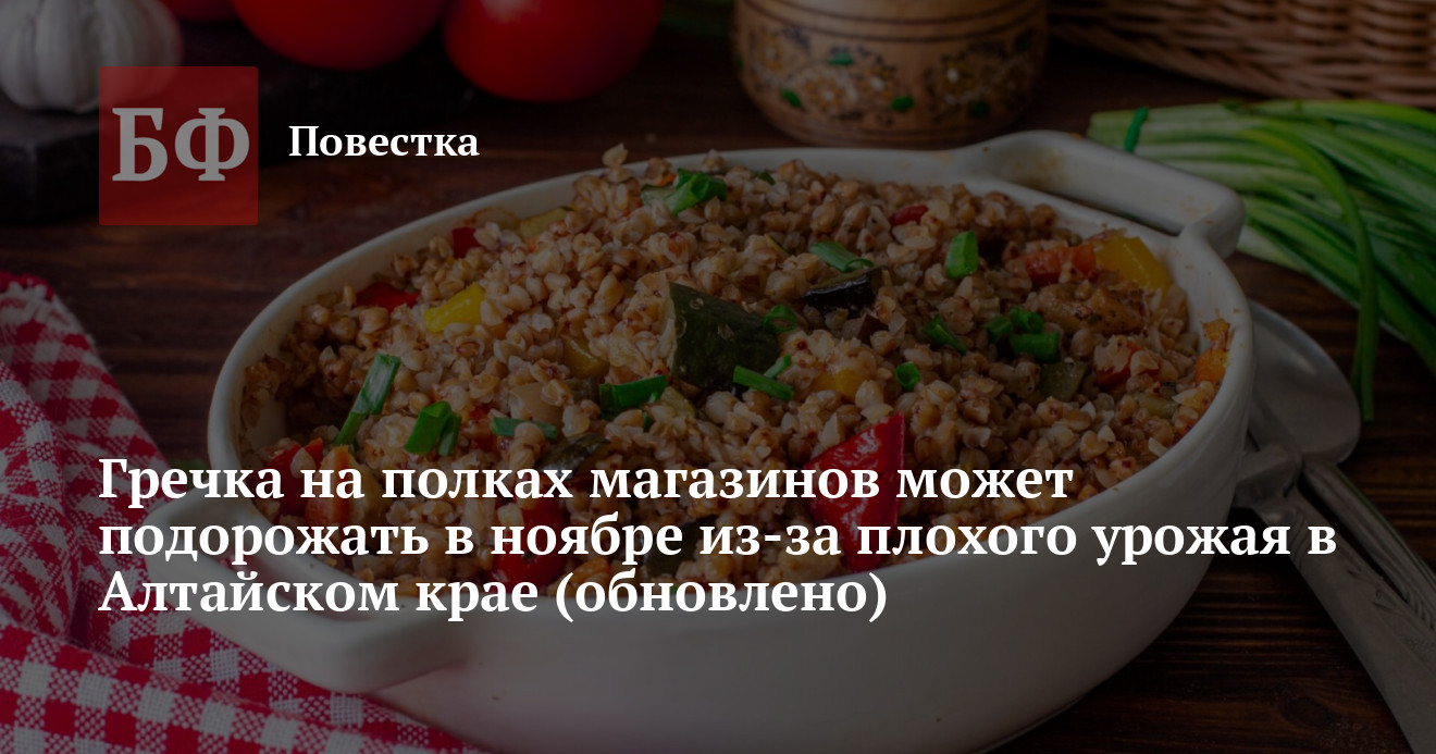 По оценкам ИКАР, стоимость гречки у алтайских производителей на 22 октября была на уровне 80,3 рублей за килограмм, а годом ранее — 56,9 рублей за килограмм. По подсчетам «Коммерсанта», гречка и овес с 1 августа по 15 октября в Алтайском крае подорожали на 38% и 32% соответственно, цены на ячмень выросли на 36%. При том, что гречневая крупа по состоянию на август в среднем по РФ стоила 80,47 рублей за килограмм.