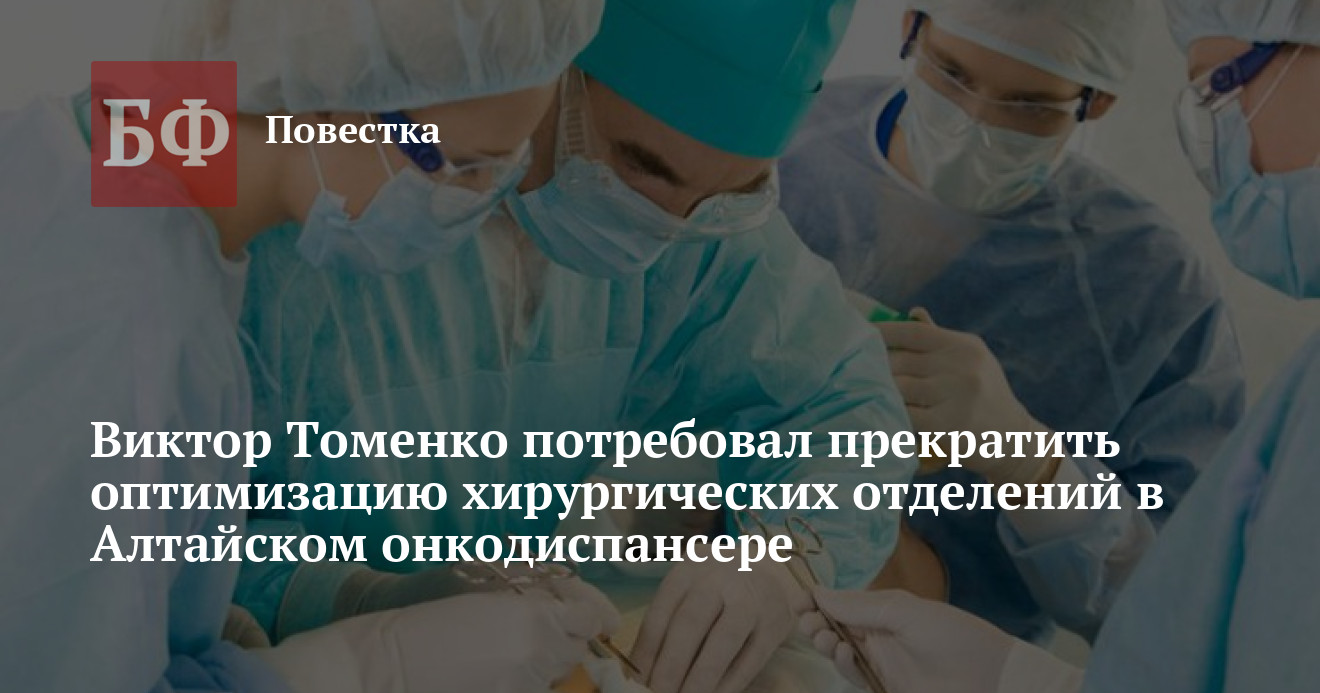 Губернатор Алтайского края Виктор Томенко распорядился приостановить оптимизацию в Алтайском краевом онкологическом диспансере, из-за которой несколько высококвалифицированных хирургов могли потерять работу или перейти на должности уборщиков, а число коек — существенно сократиться. Как сообщает пресс-служба правительства, глава региона будет лично разбираться в этой скандальной истории.