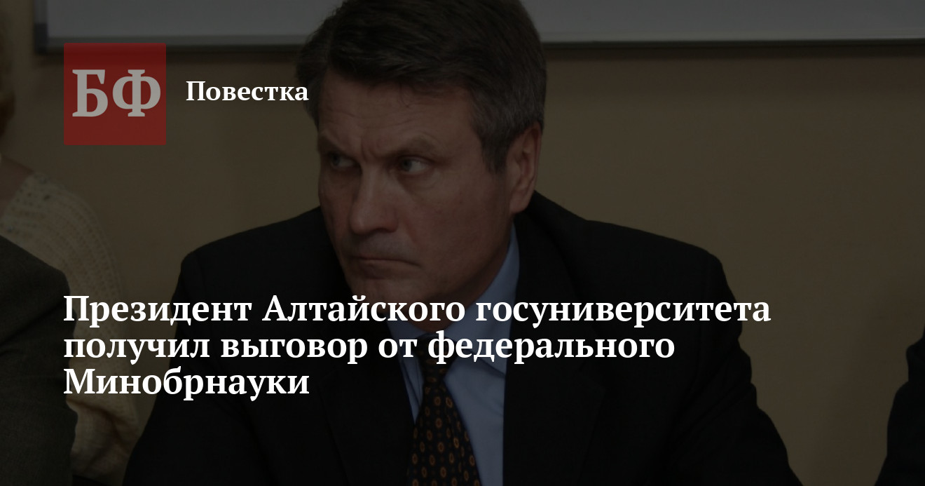 В Министерстве науки и высшего образования Российской Федерации объявили выговор президенту АлтГУ Сергею Землюкову. Данную информацию «Банкфаксу» подтвердили в пресс-службе ведомства. При этом в ответе не раскрываются причины, по которым Землюкова привлекли к дисциплинарной ответственности. Вместе с тем источники агентства утверждают, что поводом могли стать результаты прокурорской проверки, в ходе которой якобы вскрылись факты нарушения Землюковым антикоррупционного законодательства.