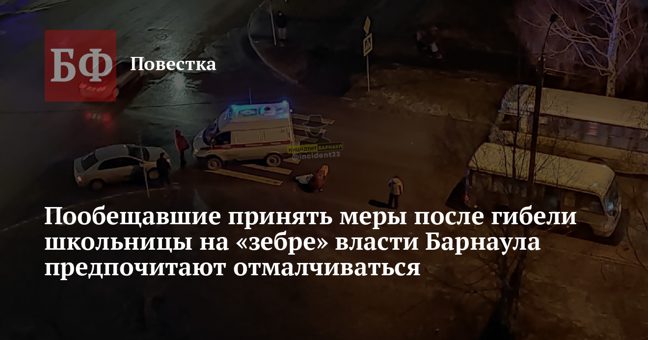 Несмотря на публичные заявления мэрии Барнаула о том, что дорожный комитет администрации разберется в трагической гибели 13-летней девочки под колесами маршрутки на пешеходном переходе, спустя пять дней после инцидента пресс-служба продолжает хранить молчание и игнорировать вопросы журналистов на эту тему. При этом именно мэрия должна отвечать за организацию движения в городе и содержание дорог. Среди горожан все громче звучат предположения о том, что чиновники ответственны за гибель ребенка, и нынешняя попытка отмолчаться, а также авральные работы на перекрестке на утро после трагедии связаны с этим. Накал возмущения среди родительской общественности также растет — они недоумевают, почему перекресток так плохо освещен и не имеет светофора, но ни полицейские, ни чиновники не принимают меры. По сведениям ИА «Банкфакс», уже начался сбор подписей под обращением к властям.
