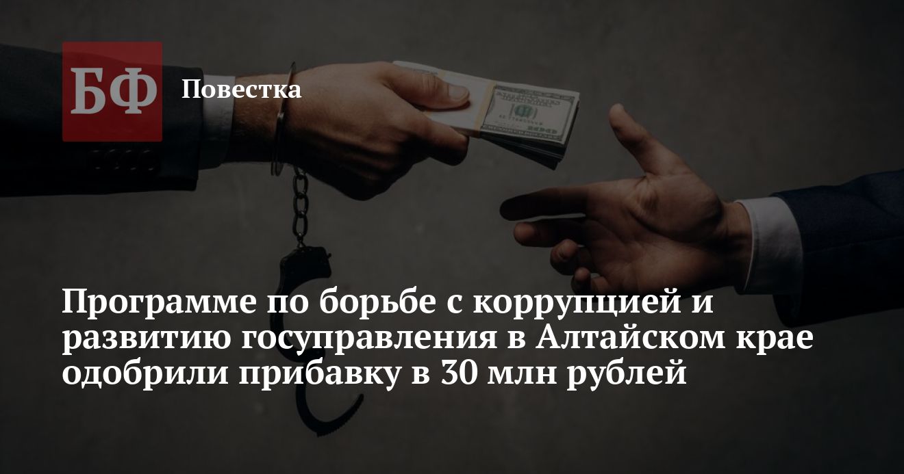 В 2021 году правительство Алтайского края увеличило расходы на реализацию программы по совершенствованию государственного и муниципального управления и противодействию коррупции более чем на 30 млн рублей. Счетная палата (СП) региона проверила соответствующее постановление и вынесла положительное заключение, следует из документа, опубликованного на сайте органа. «Банкфакс» выяснил, как в регионе ведется антикоррупционная работа и сколько на нее выделяется средств. По официальным отчетам мздоимство на Алтае терпит поражение.