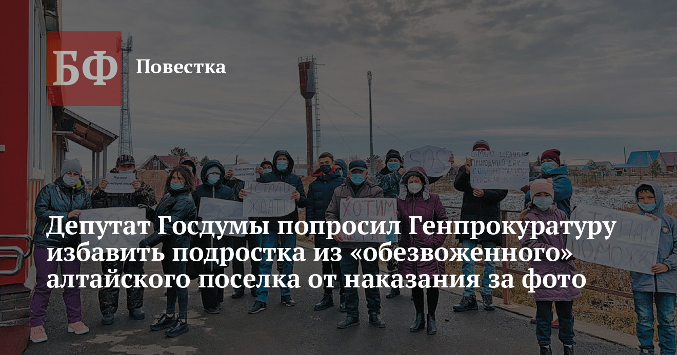 Депутат Госдумы Сергей Шаргунов подключился к ситуации жителей барнаульского поселка Сибирская долина, которых продолжают наказывать за требование качественного водоснабжения. Как сообщает «Российская газета», он обратился к Генпрокурору и губернатору Алтайского края, чтобы защитить подростка и его мать, попавших под санкции правоохранителей за фотосессию с плакатами о призыве к властям решить проблему. Между тем выяснились любопытные подробности этой истории: оказалось, что фотоаппарат, который стал «орудием преступления», школьнику подарили сами алтайские чиновники по поручению президента.
