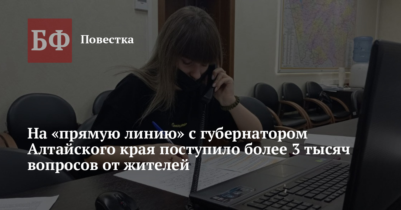 23 ноября в 17:00 в Алтайском крае впервые состоится «прямая линия» с губернатором Виктором Томенко, который ответит на вопросы, наиболее волнующие жителей региона. По состоянию на 12:00 ему направили 3398 обращений. Впрочем, ожидается, что до начала эфира эта цифра еще увеличится. Тем временем у жителей края возникают вопросы к качеству приема и обработки этих обращений, а также проведению самой «прямой линии».